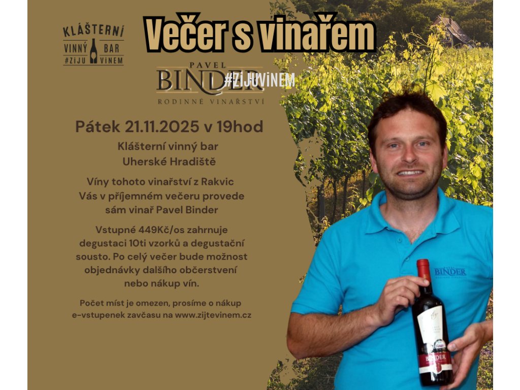 Degustací a příjemným večerem plným vína a povídání o víně Vás provede sám vinař Pavel Binder z Rakvic.